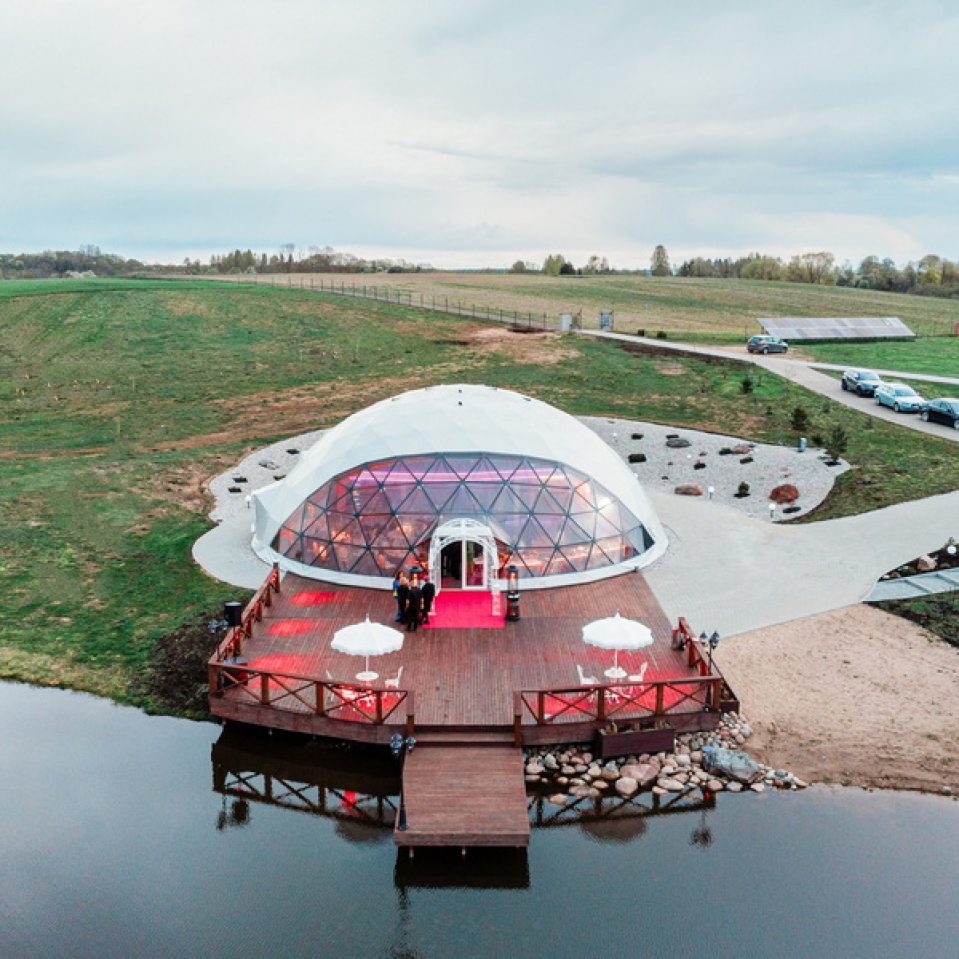The “VIP Dome” project in Liutonys, Lithuania, is a distinctive and exclusive space designed for events, conferences, and other special occasions. The dome itself covers an area of 254 square meters, complemented by a VIP loft space of 100 square meters. Nestled in the picturesque Degučiai Valley, this modern structure is built using cutting-edge technology, offering a sense of luxury and elegance.
