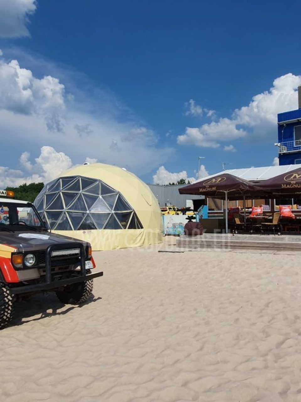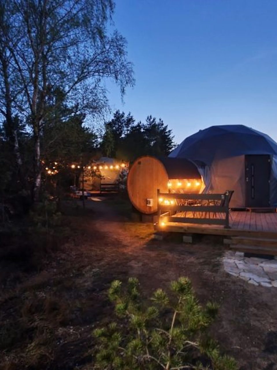 Introduction of this season, a 8 meter diameter dome of 50 m2 – GLAMPING DOME. One can watch the sunsets through the dome window during any weather. The dome is adapted for air temperatures of -30 to +80 degree Celsius and has a THERMIC.PRO13+ thermal membrane.