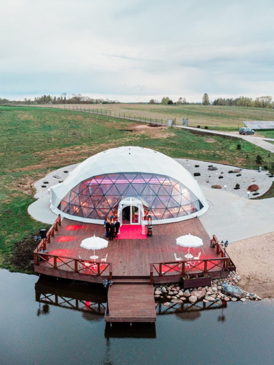The “VIP Dome” project in Liutonys, Lithuania, is a distinctive and exclusive space designed for events, conferences, and other special occasions. The dome itself covers an area of 254 square meters, complemented by a VIP loft space of 100 square meters. Nestled in the picturesque Degučiai Valley, this modern structure is built using cutting-edge technology, offering a sense of luxury and elegance.