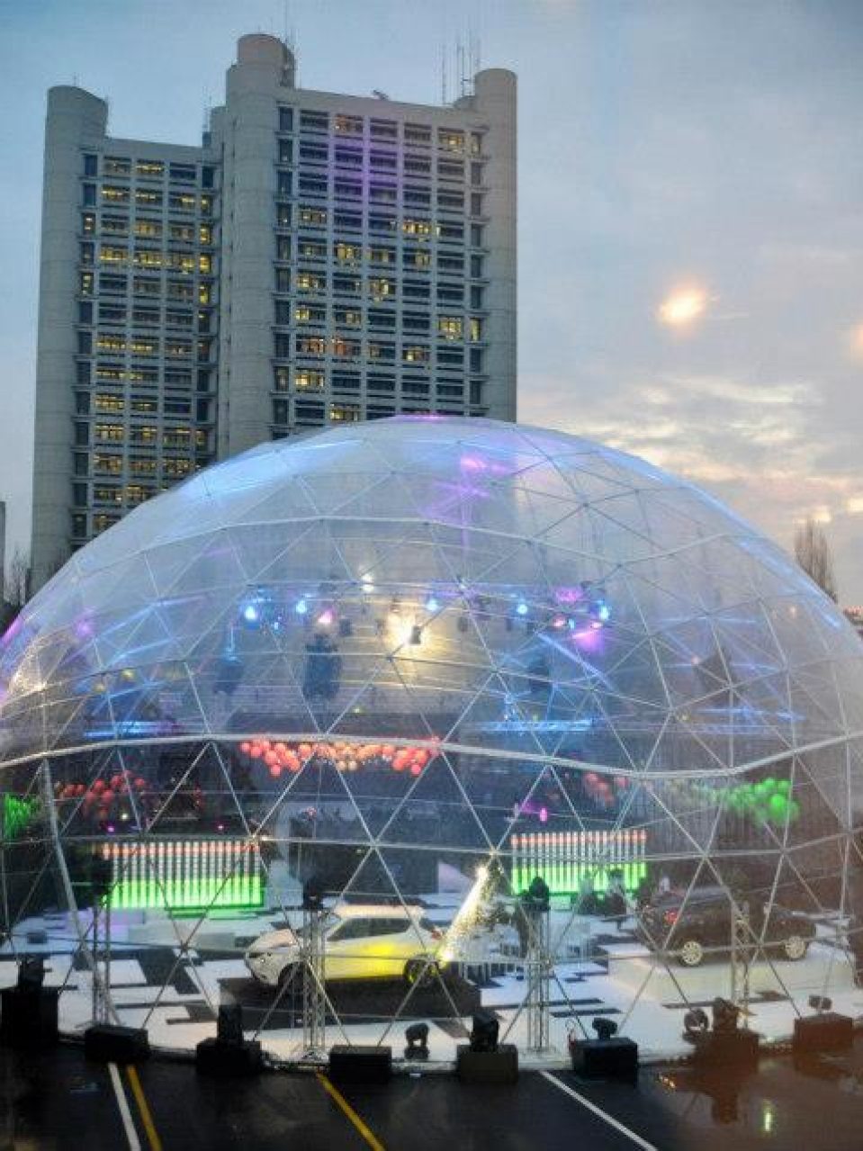 Dome 28 meters in diameter, placed in Bologna (Italy) to promote new models of Nissan Juke. At the Bologna Motor Show 2012 Nissan has brought its range of sport cars and surprised even the unique Juke-R. Exhibited for the first time in Dubai in January 2012 this car has been a great success so the Ray Mallock Ltd. under the supervision of Nissan Technical Centre Europe decided to continue the development of the car. The engine is the 3.8 V6 twin-turbo from GT-R r35 with 545 hp capable of pushing the little juke to 275 km/h and sprint from 0 to100 km/h in about 3 seconds