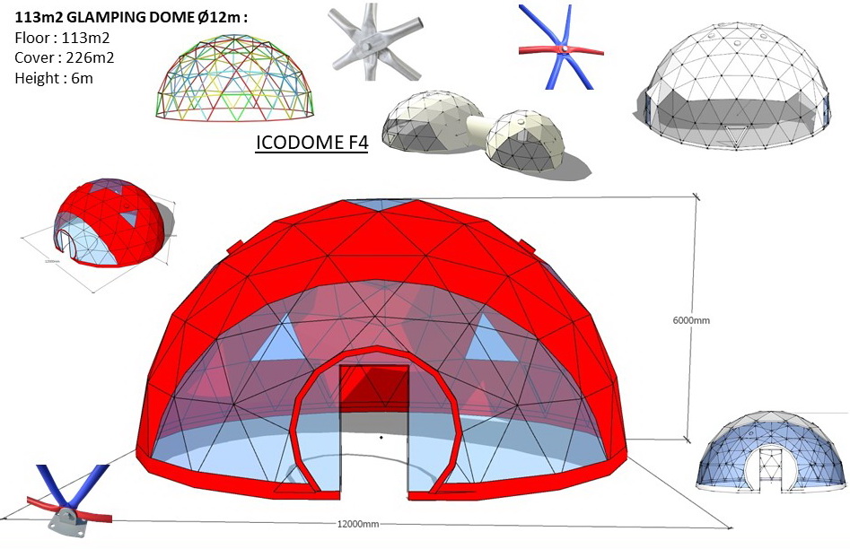 Glamping Domes do not require any columns, load walls or columns inside to allow the customers to use the maximum available area. By using steel structural elements structure becomes sustainable in terms of weather factors, livetime and loads.- The structures can be connected with tunnel paths;
