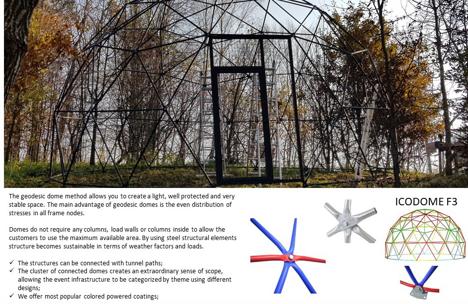 The geodesic dome structure allows you to create a light, well protected and very stable space. The main advantage of geodesic domes is the even distribution of stresses in all frame nodes.