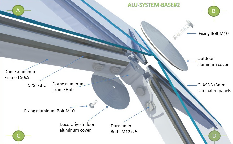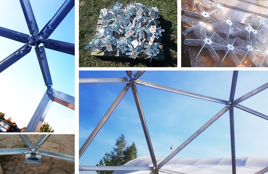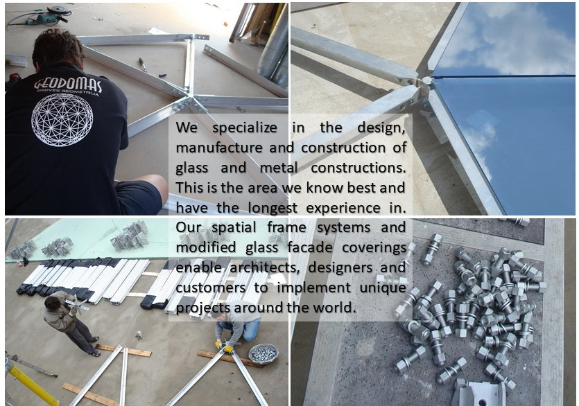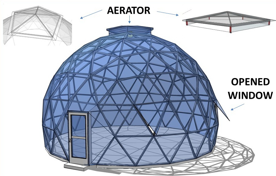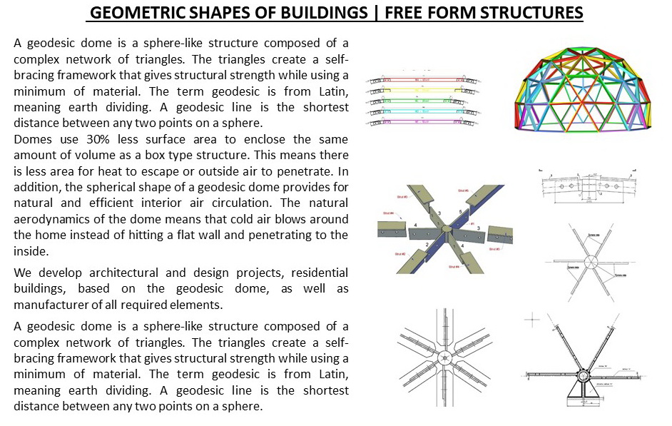 Domes use 30% less surface area to enclose the same amount of volume as a box type structure. This means there is less area for heat to escape or outside air to penetrate. In addition, the spherical shape of a geodesic dome provides for natural and efficient interior air circulation. The natural aerodynamics of the dome means that cold air blows around the home instead of hitting a flat wall and penetrating to the inside.We develop architectural and design projects, residential buildings, based on the geodesic dome, as well as manufacturer of all required elements.