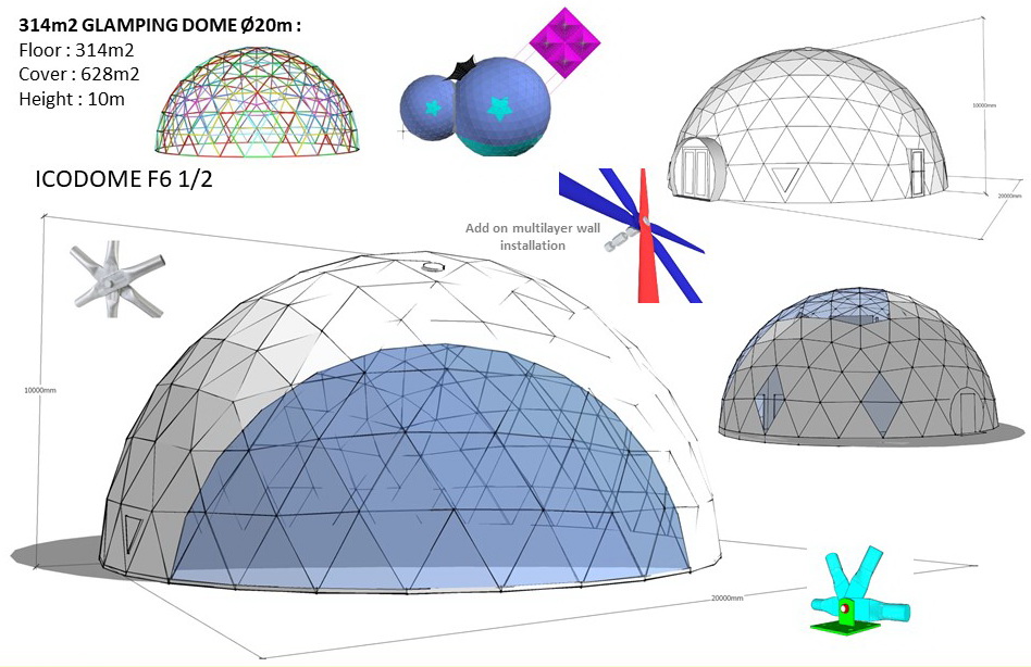 Glamping Domes do not require any columns, load walls or columns inside to allow the customers to use the maximum available area. By using steel structural elements structure becomes sustainable in terms of weather factors, livetime and loads.- The structures can be connected with tunnel paths;