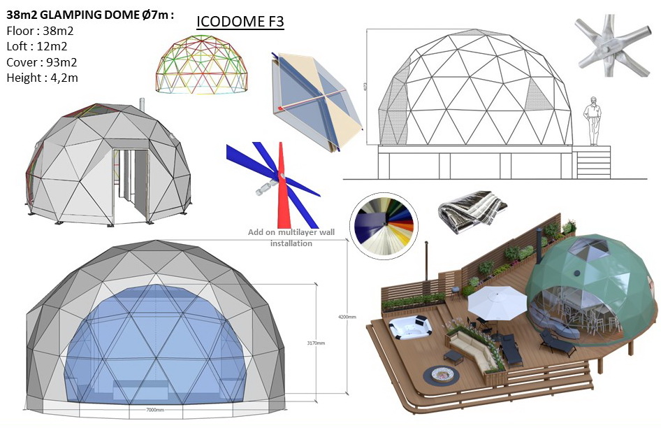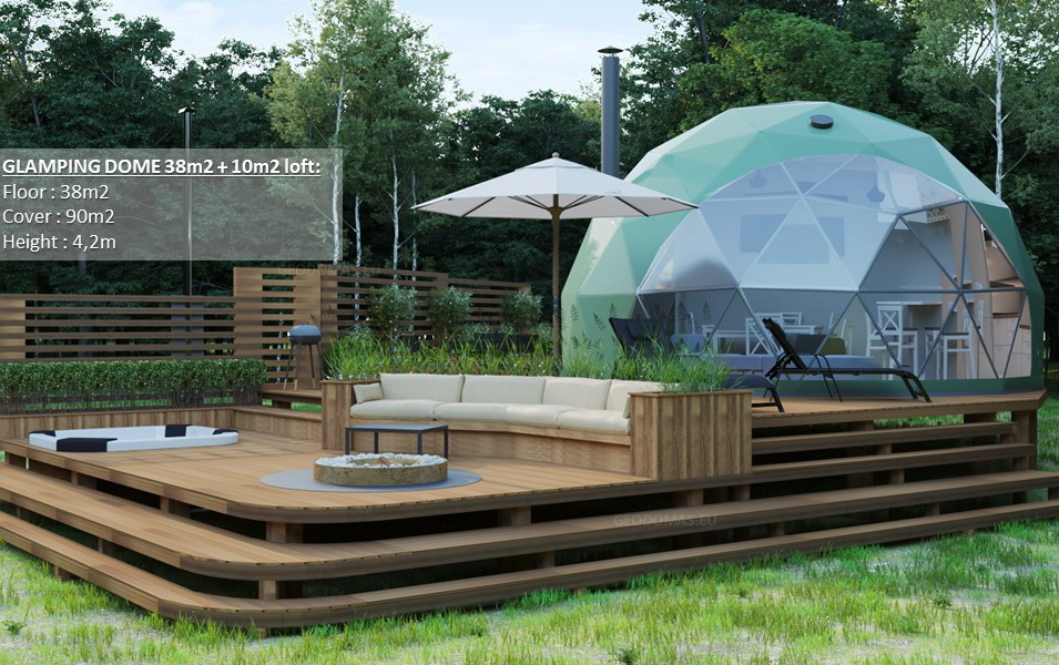 Glamping Domes do not require any columns, load walls or columns inside to allow the customers to use the maximum available area. By using steel structural elements structure becomes sustainable in terms of weather factors, livetime and loads.- The structures can be connected with tunnel paths;
