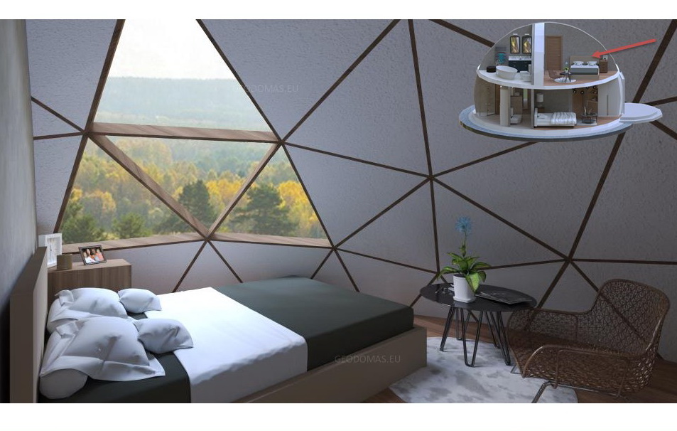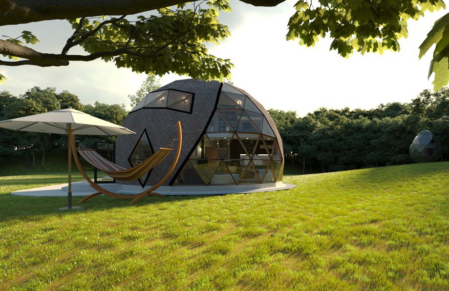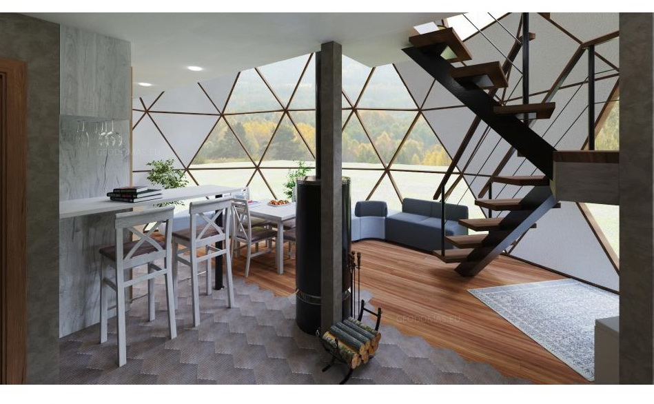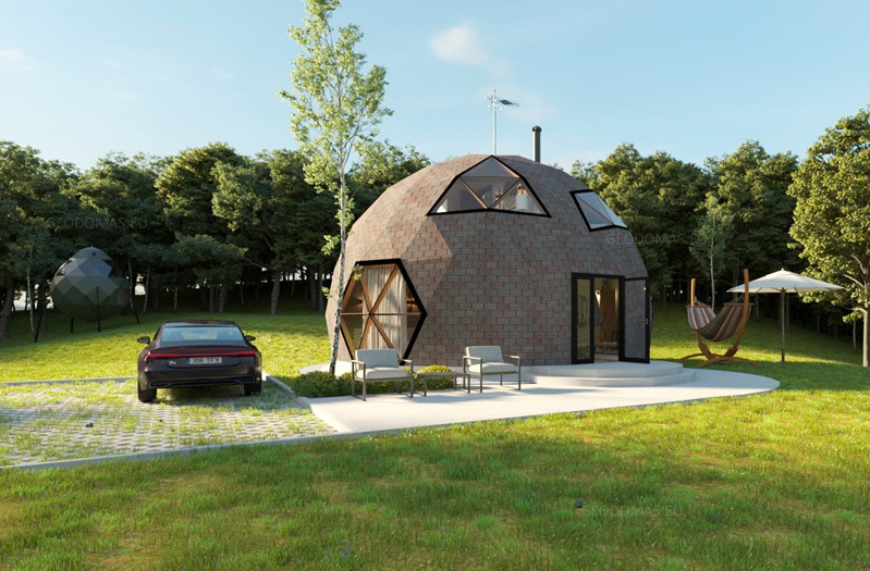 Triangular shaped panels, façade slabs COSMO PANEL 25mm (Basic option), PVC-XPS-PVC structure of panels. Fastening elements for the slabs with a gasket. Installation glue set for seal treatment. White facade sealant-glue for the finishing and decorative works. A tin perimeter window sill for the waterproofing of the foundation. Gravitational ventillation system at the lower perimeter of the dome. A full installation set, and documentation for facade assembly.
