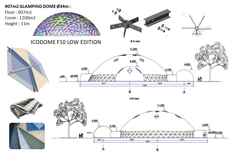 Glamping Domes do not require any columns, load walls or columns inside to allow the customers to use the maximum available area. By using steel structural elements structure becomes sustainable in terms of weather factors, livetime and loads.- The structures can be connected with tunnel paths;